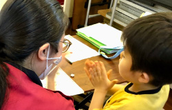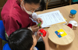 不明瞭な発音を改善するための指導です。文字を見せてほめながらくり返し練習することもあります。